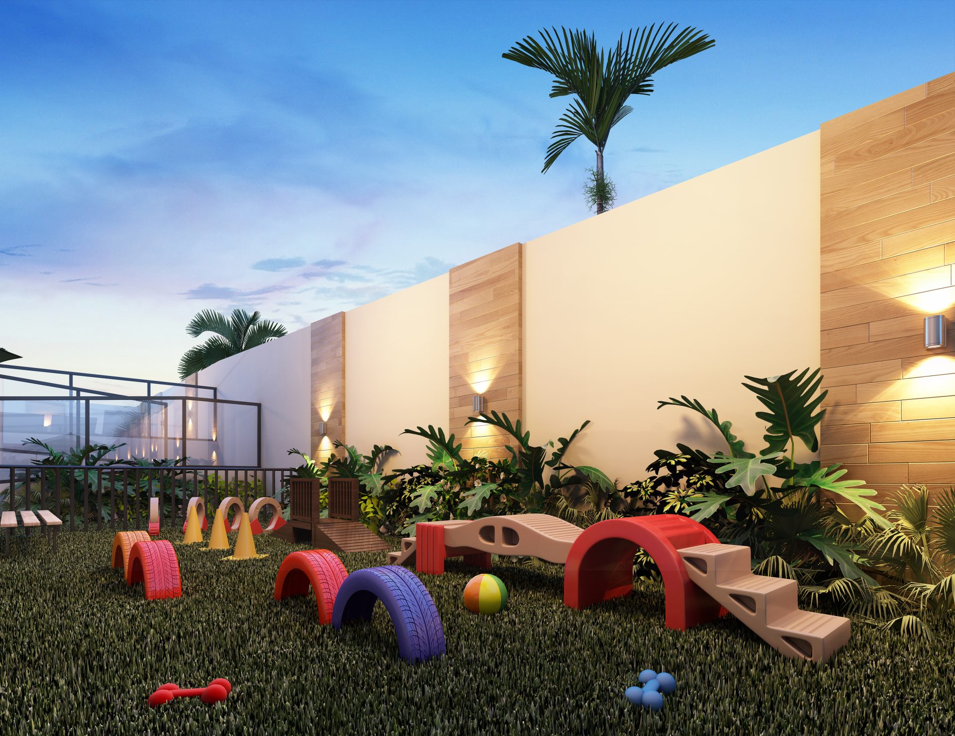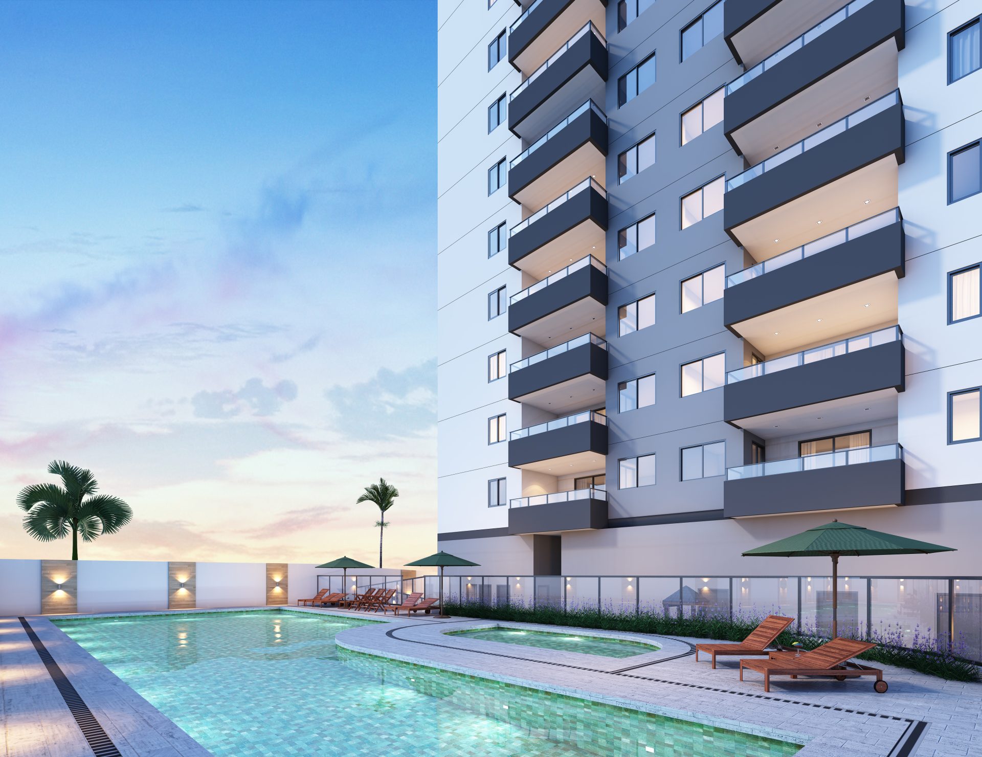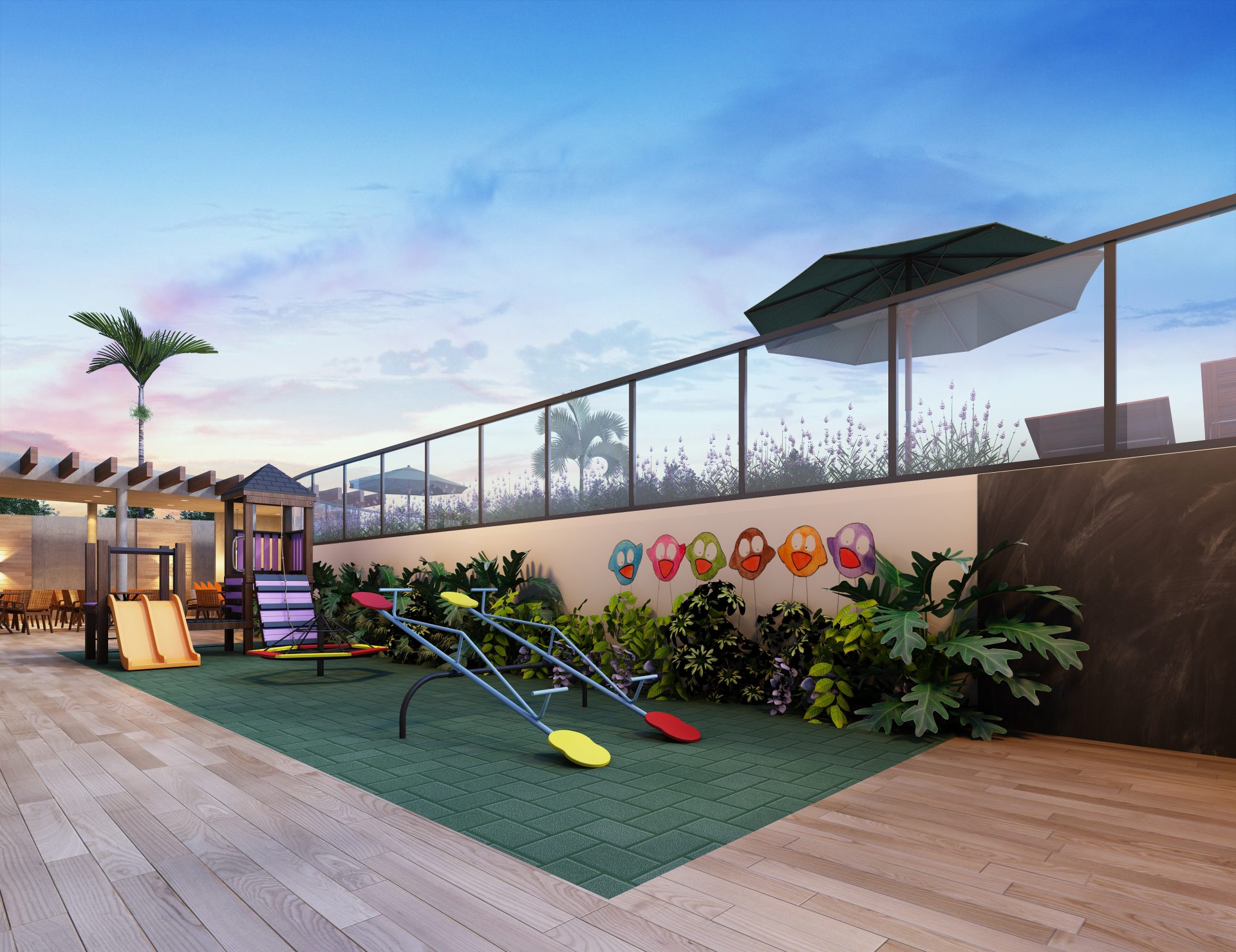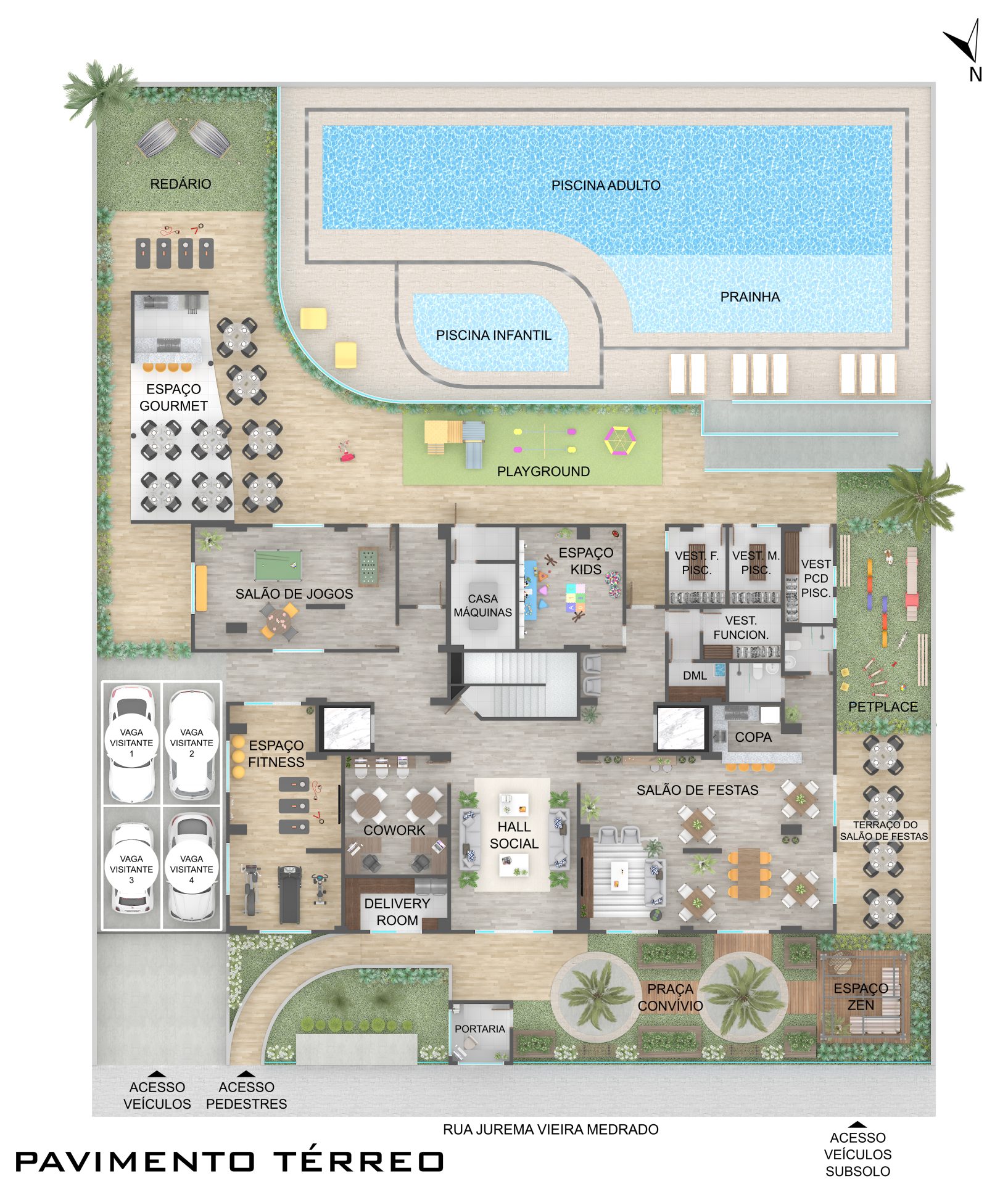 O espaço de lazer no térreo inclui, no pátio frontal, uma praça de convívio e um espaço zen. Sob a torre, estão o hall social, salão de festas com copa e banheiros exclusivos, com acesso direto ao terraço, espaço fitness, salão de jogos, coworking, espaço kids e vestiários para as piscinas, além das dependências dos funcionários. Nos fundos, temos um espaço gourmet, redário, piscina infantil e adulto com deck molhado, playground e pet place.