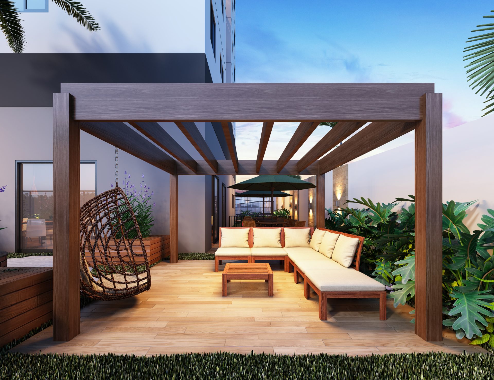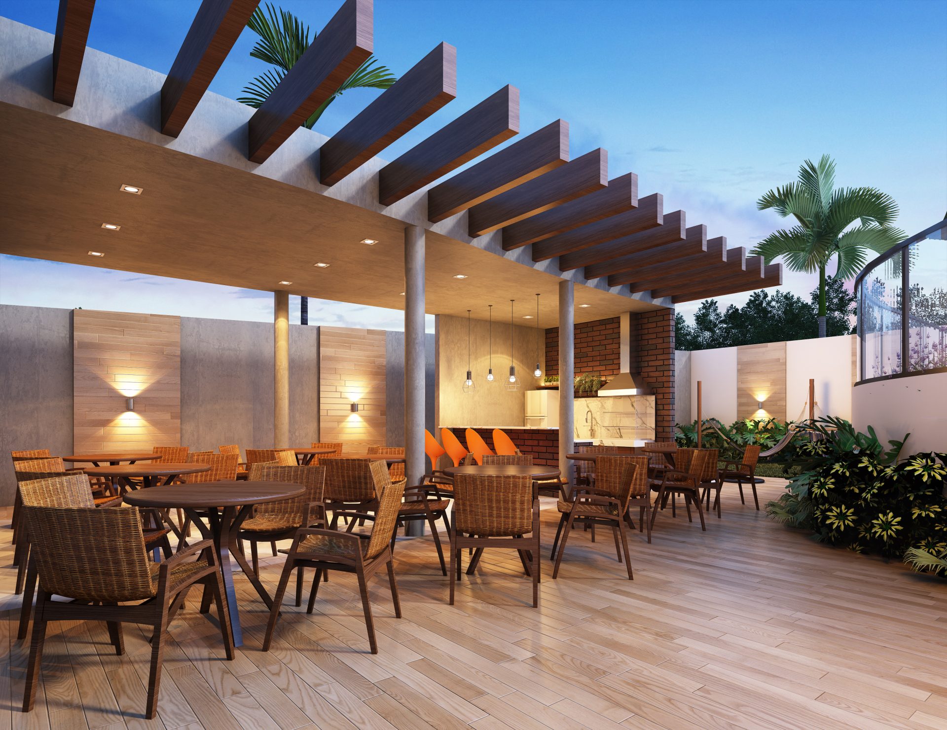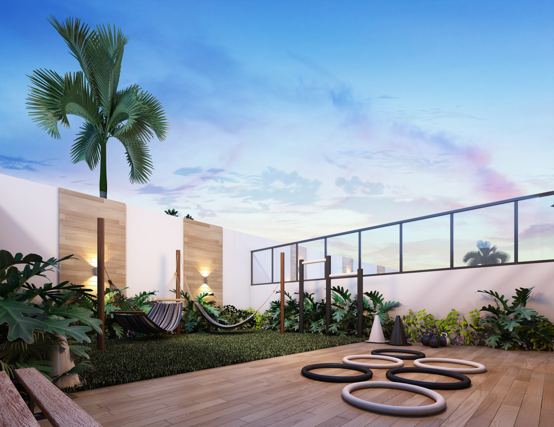O espaço de lazer no térreo inclui, no pátio frontal, uma praça de convívio e um espaço zen. Sob a torre, estão o hall social, salão de festas com copa e banheiros exclusivos, com acesso direto ao terraço, espaço fitness, salão de jogos, coworking, espaço kids e vestiários para as piscinas, além das dependências dos funcionários. Nos fundos, temos um espaço gourmet, redário, piscina infantil e adulto com deck molhado, playground e pet place.