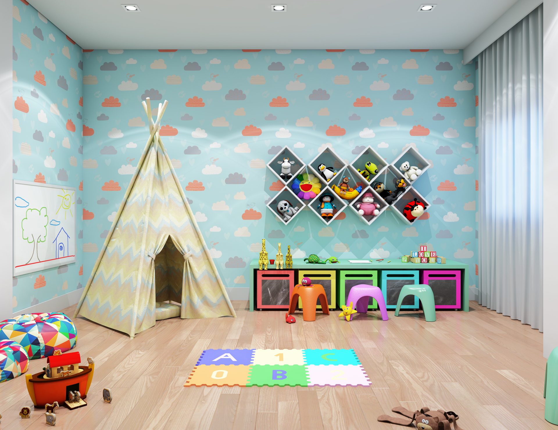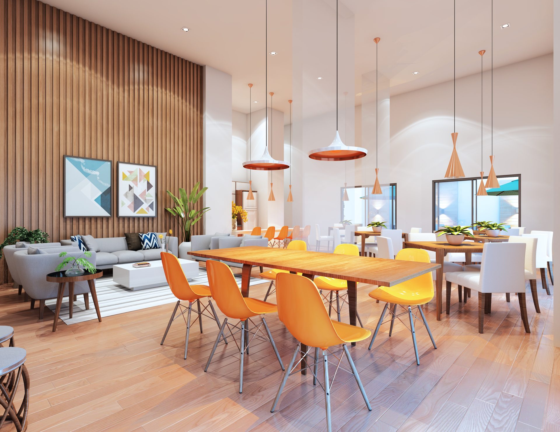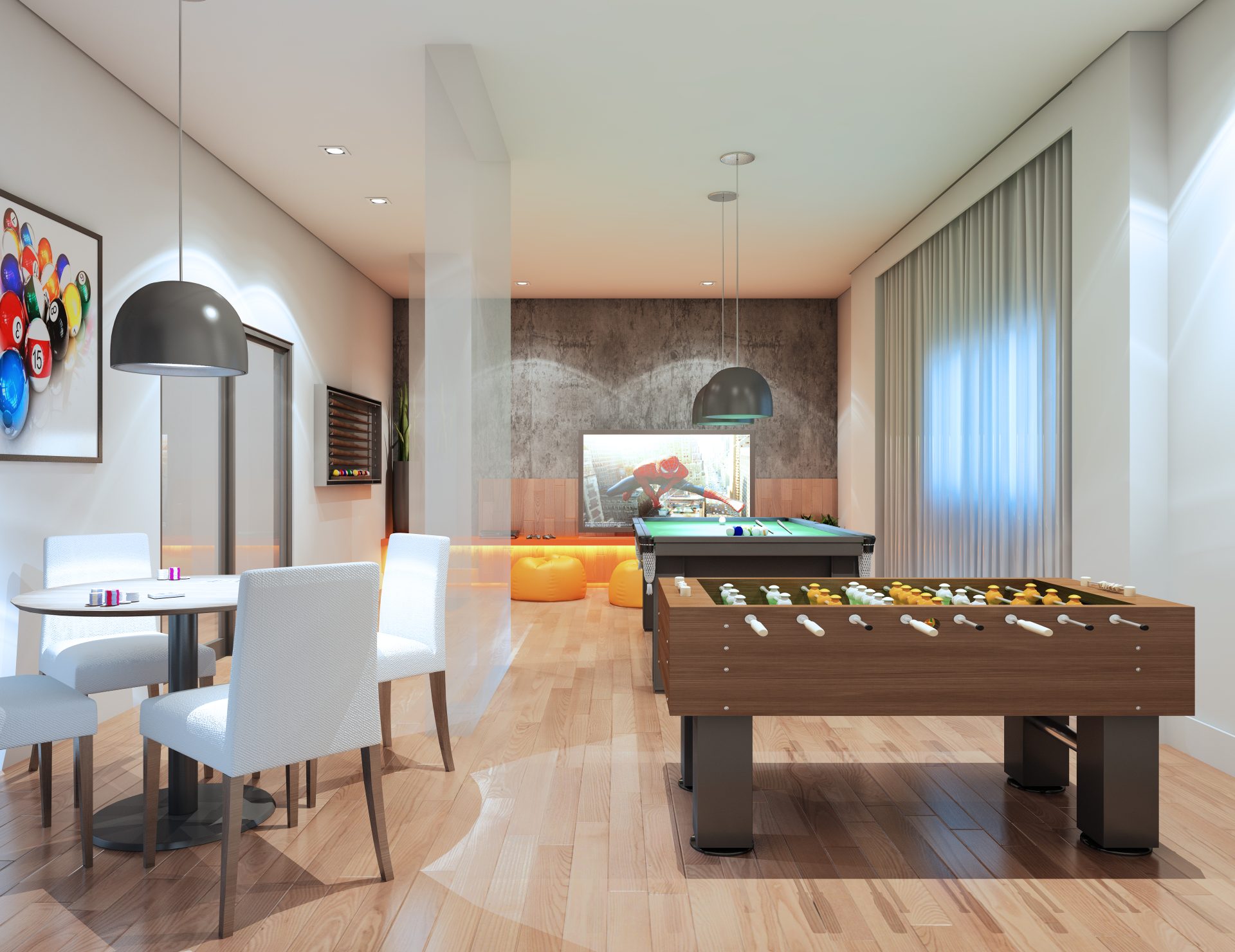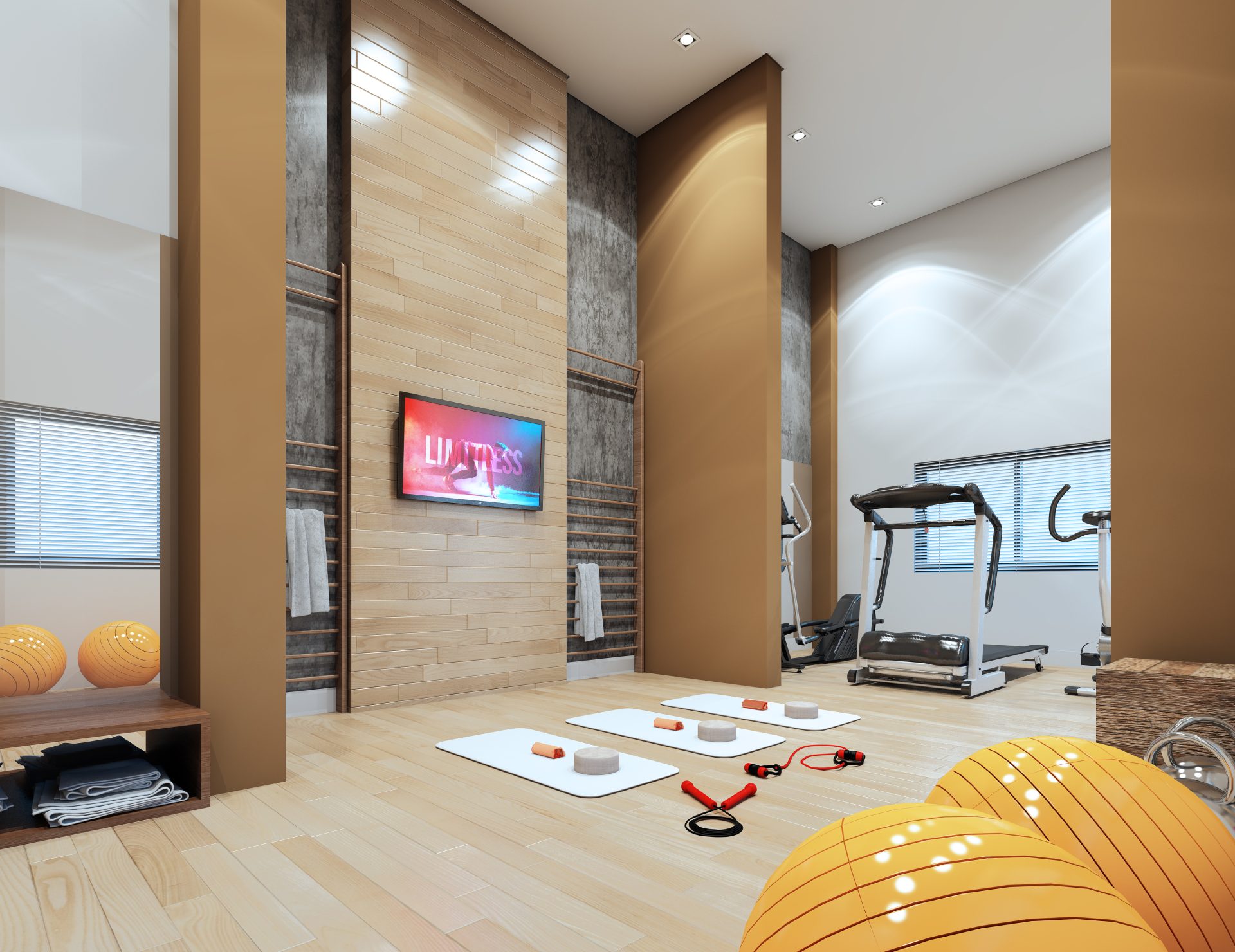 O espaço de lazer no térreo inclui, no pátio frontal, uma praça de convívio e um espaço zen. Sob a torre, estão o hall social, salão de festas com copa e banheiros exclusivos, com acesso direto ao terraço, espaço fitness, salão de jogos, coworking, espaço kids e vestiários para as piscinas, além das dependências dos funcionários. Nos fundos, temos um espaço gourmet, redário, piscina infantil e adulto com deck molhado, playground e pet place.