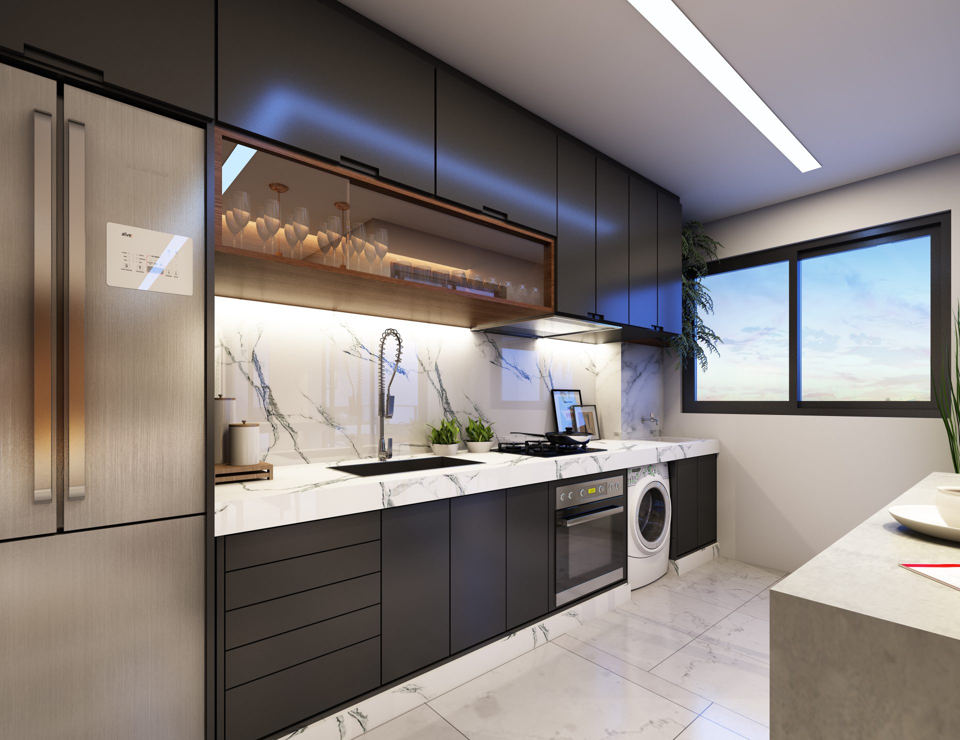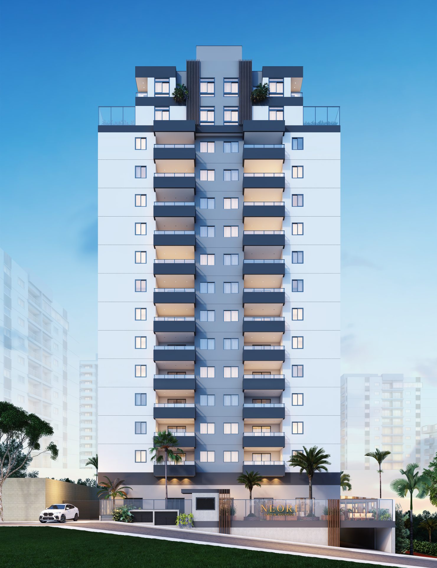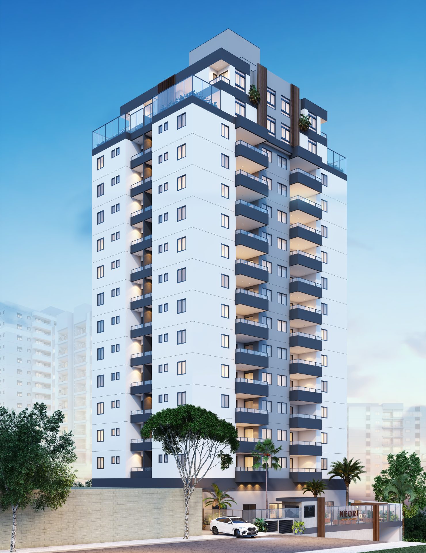 Nosso objetivo era manter as características do projeto original aprovadas pela prefeitura, propondo intervenções viáveis para sua atualização de acordo com as necessidades atuais do mercado. Essa releitura incluiu um novo layout para o pavimento térreo, apartamentos e unidades duplex, além de uma nova proposta de fachada e a responsabilidade pelo novo projeto executivo, garantindo a compatibilização com os projetos complementares.