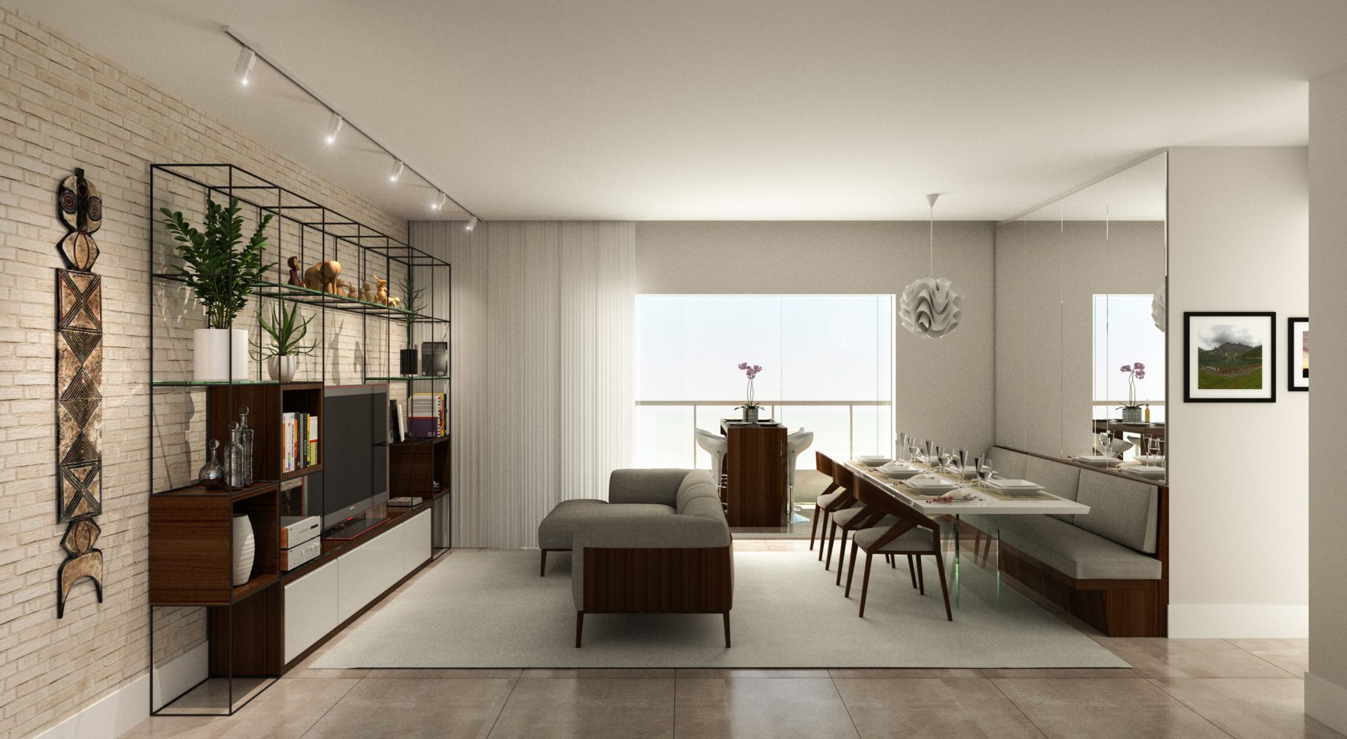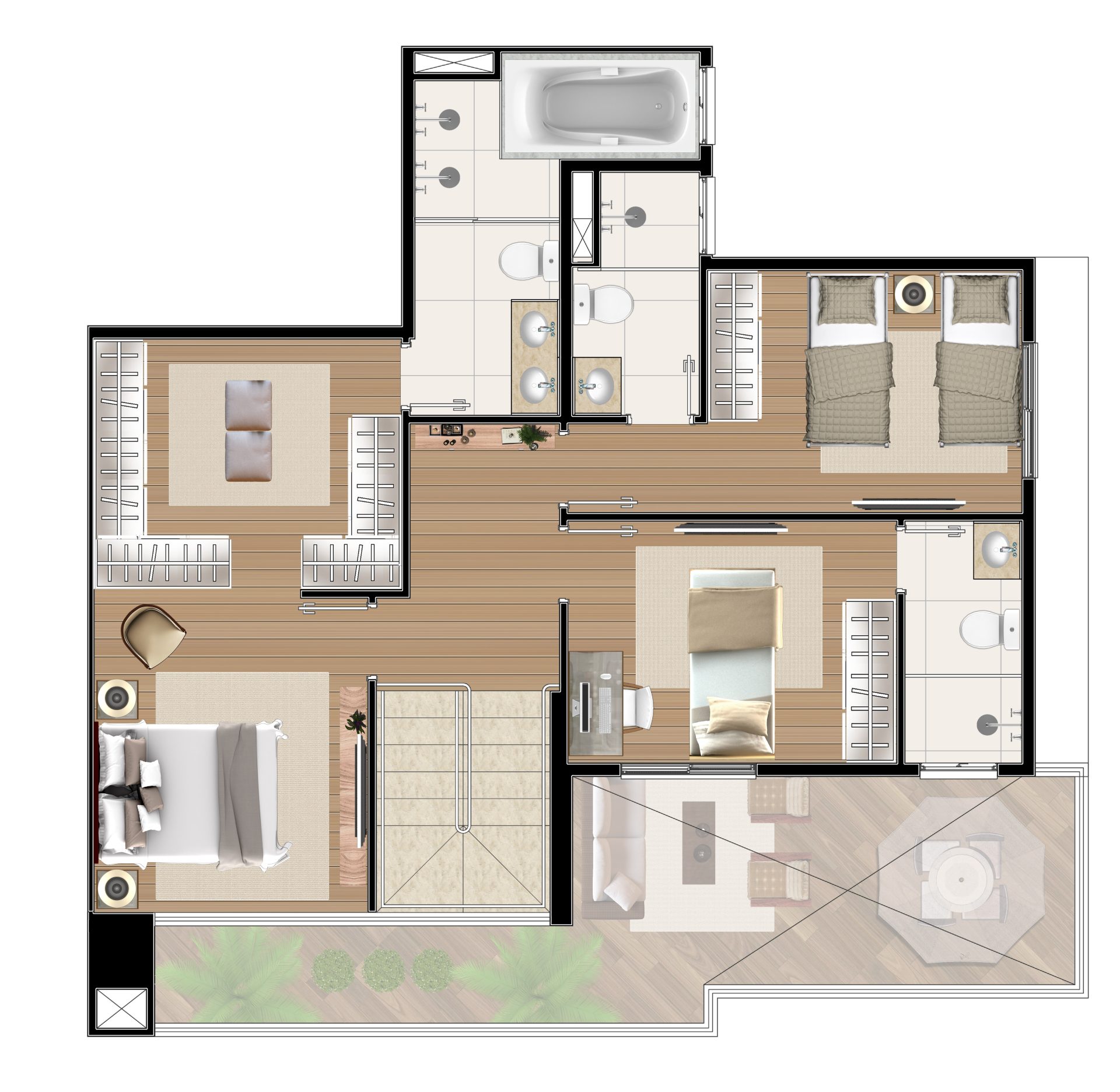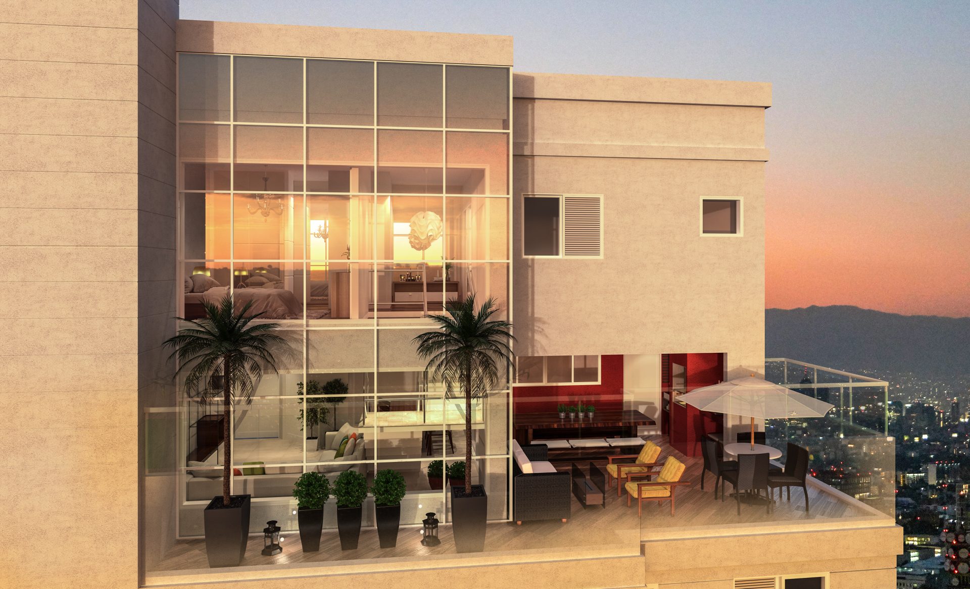 Concluímos esta proposta ousada com as plantas dos 4 apartamentos da cobertura, que são unidades duplex de 130m². No pavimento inferior, encontram-se a sala de estar e jantar, cozinha, lavabo, terraço (parcialmente coberto) com churrasqueira, além do solário. No pavimento superior, temos 3 suítes, sendo a suíte master equipada com um spa. A suíte master e a sala de estar foram projetadas com uma pele de vidro, para o máximo aproveitamento da paisagem.