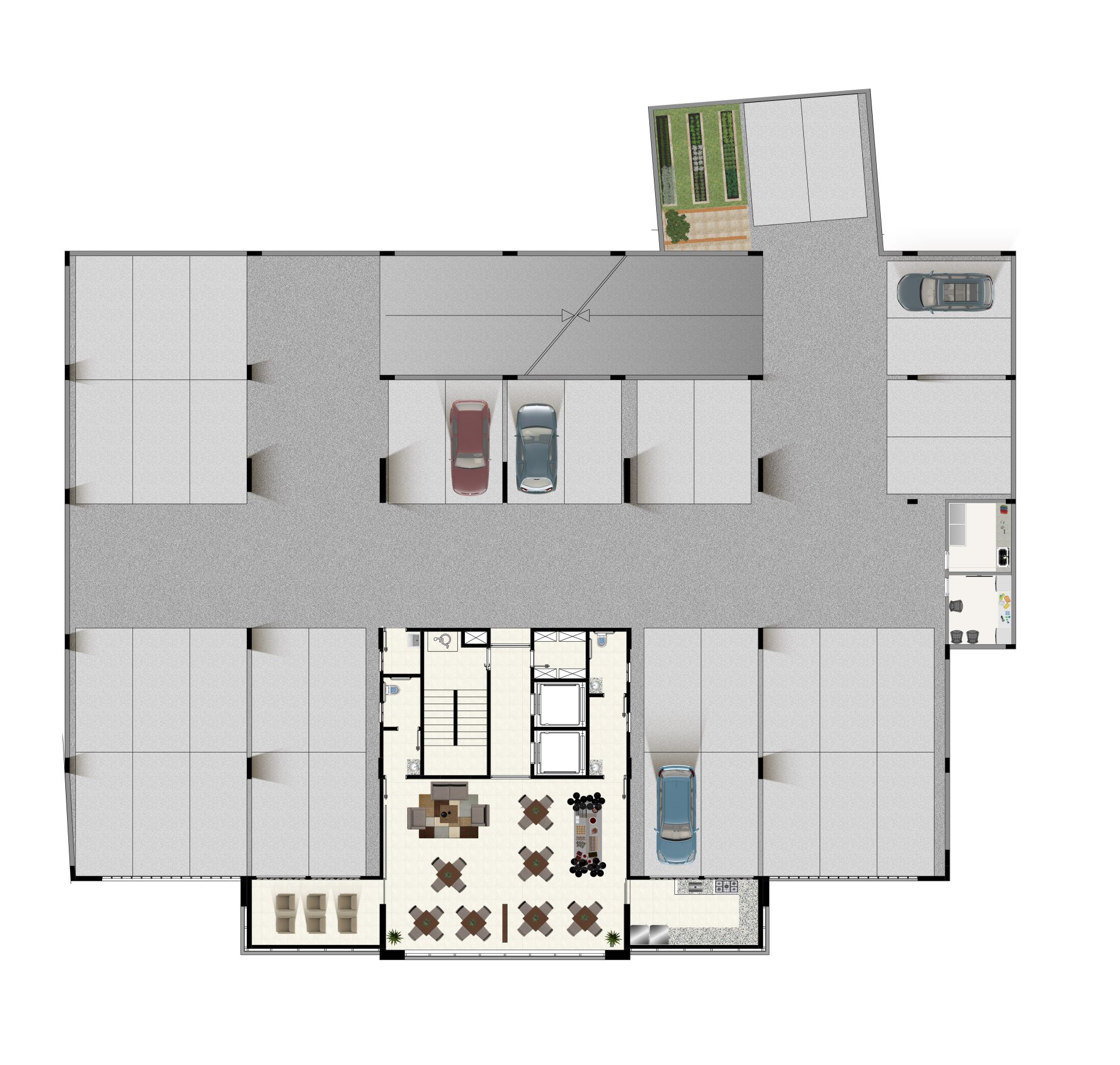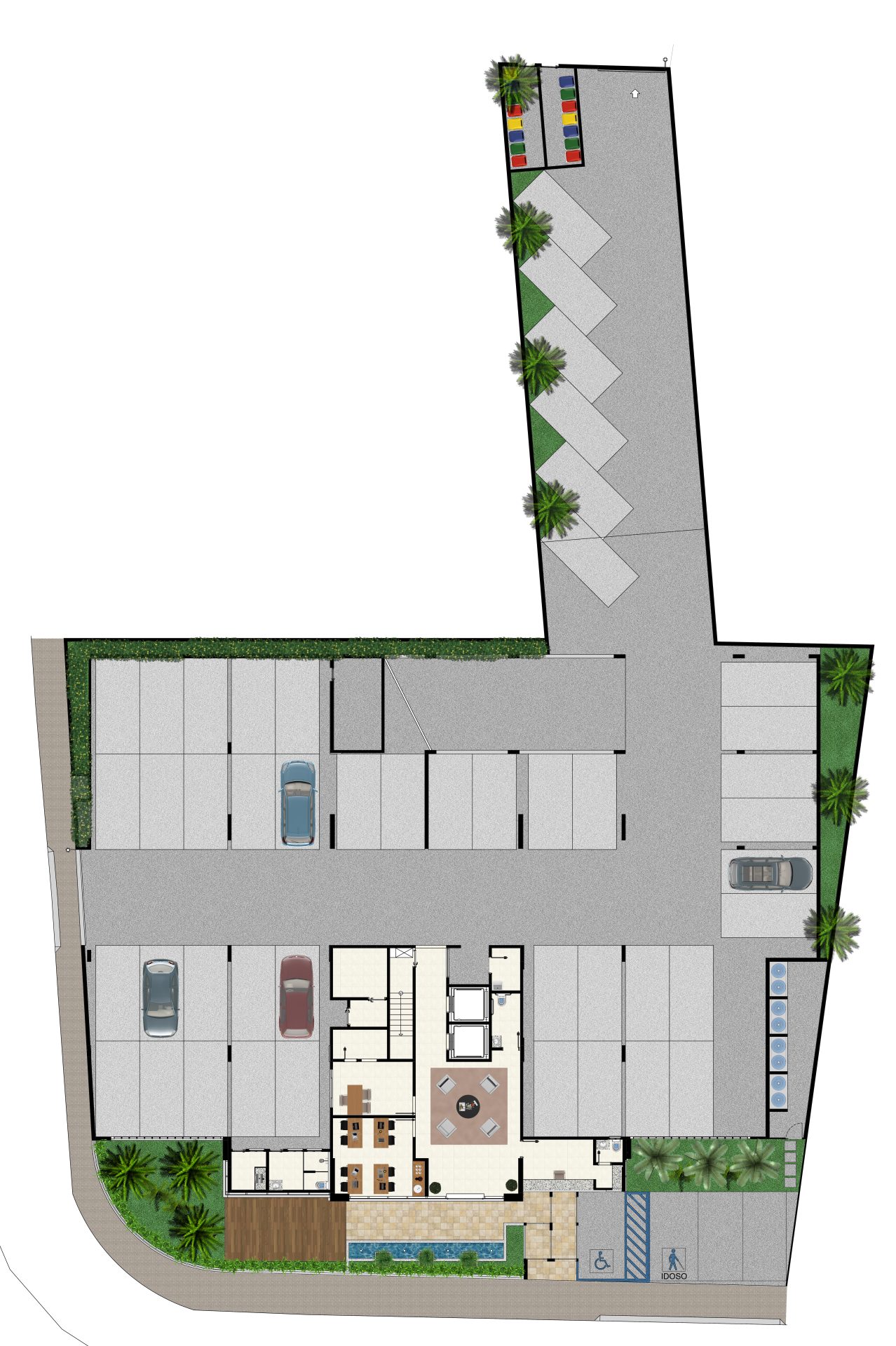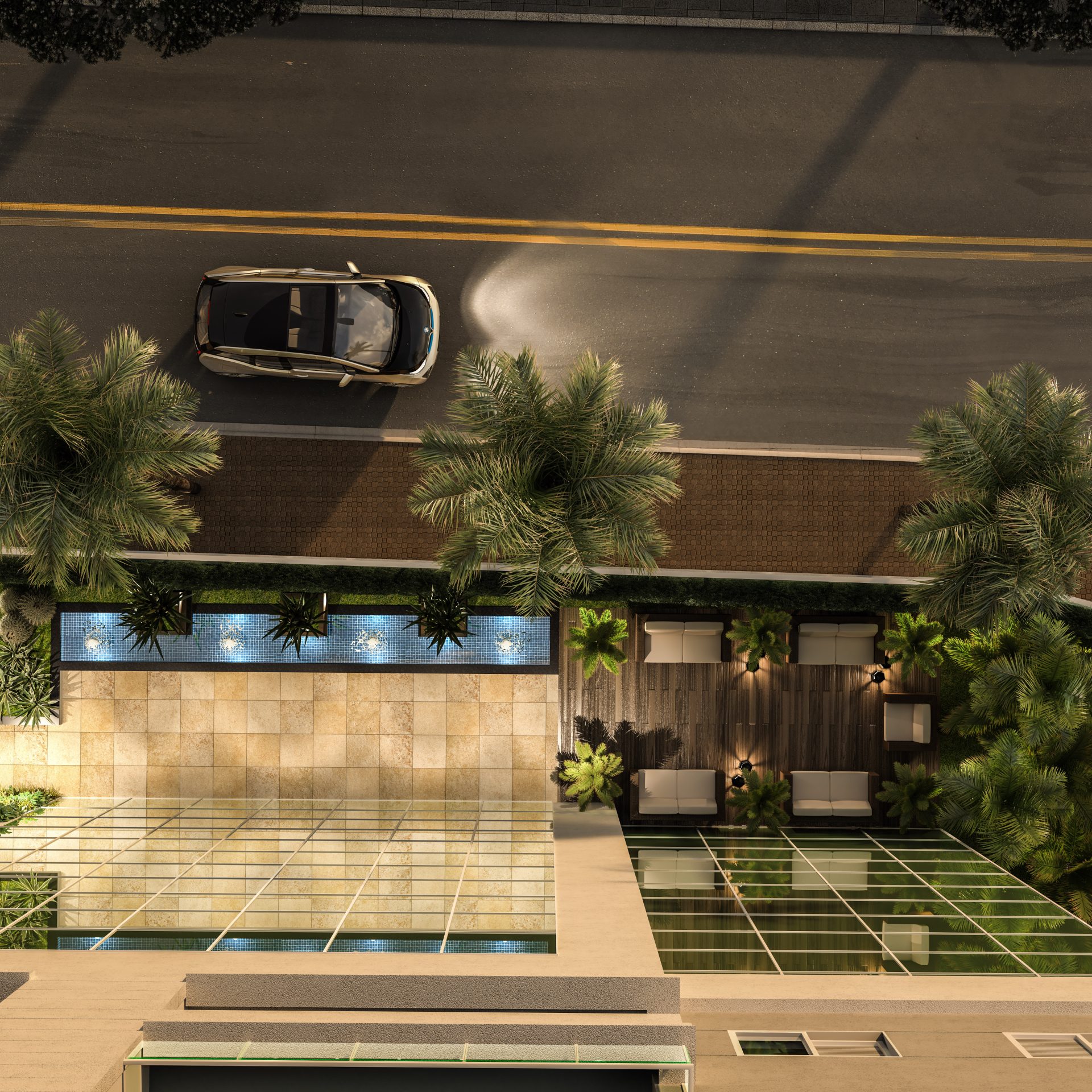 No térreo, além das 46 vagas de estacionamento, há um pátio frontal de acesso para pedestres, com área de convivência e espelho d’água, hall social, portaria, sala de administração, espaço business e 5 vagas para visitantes.