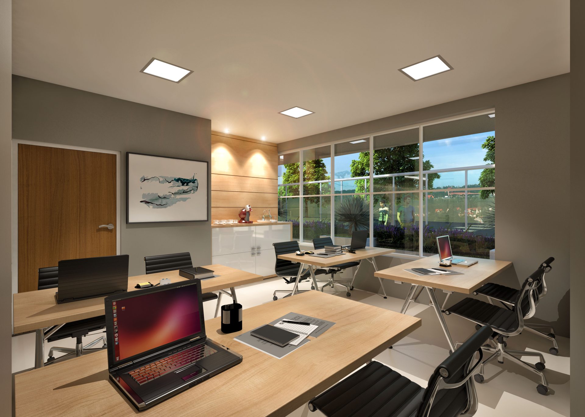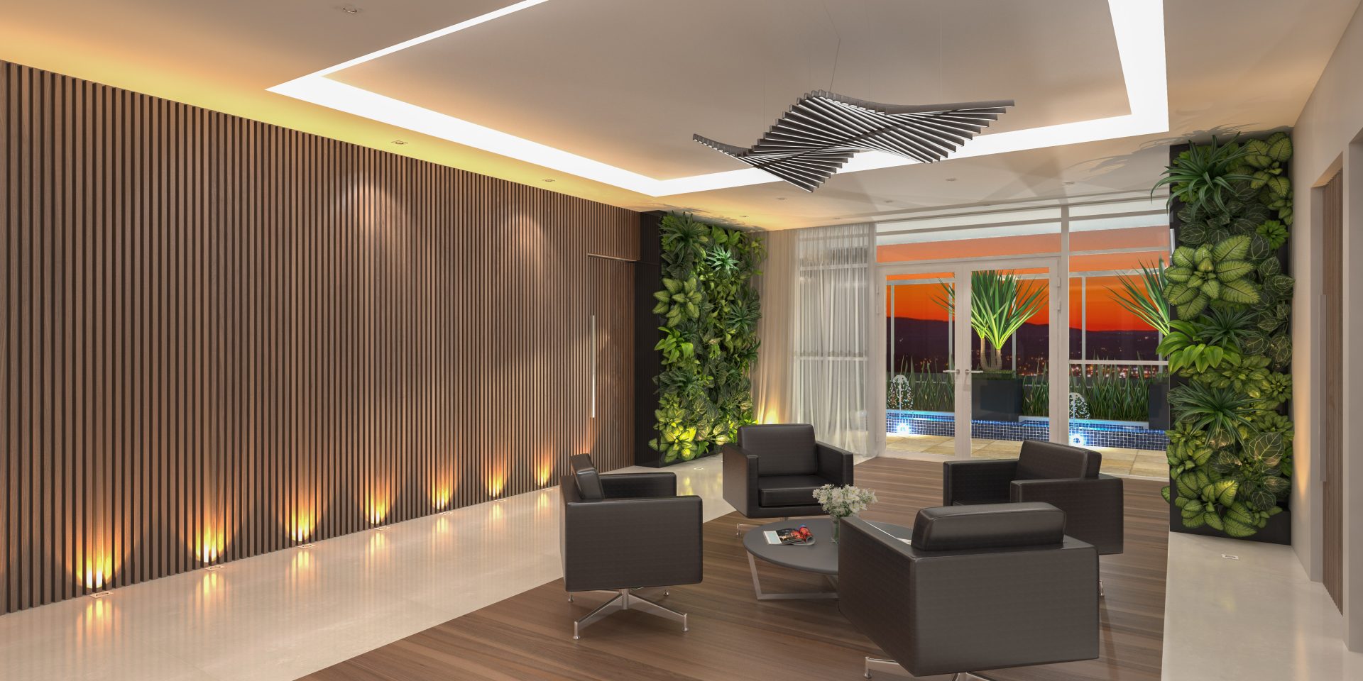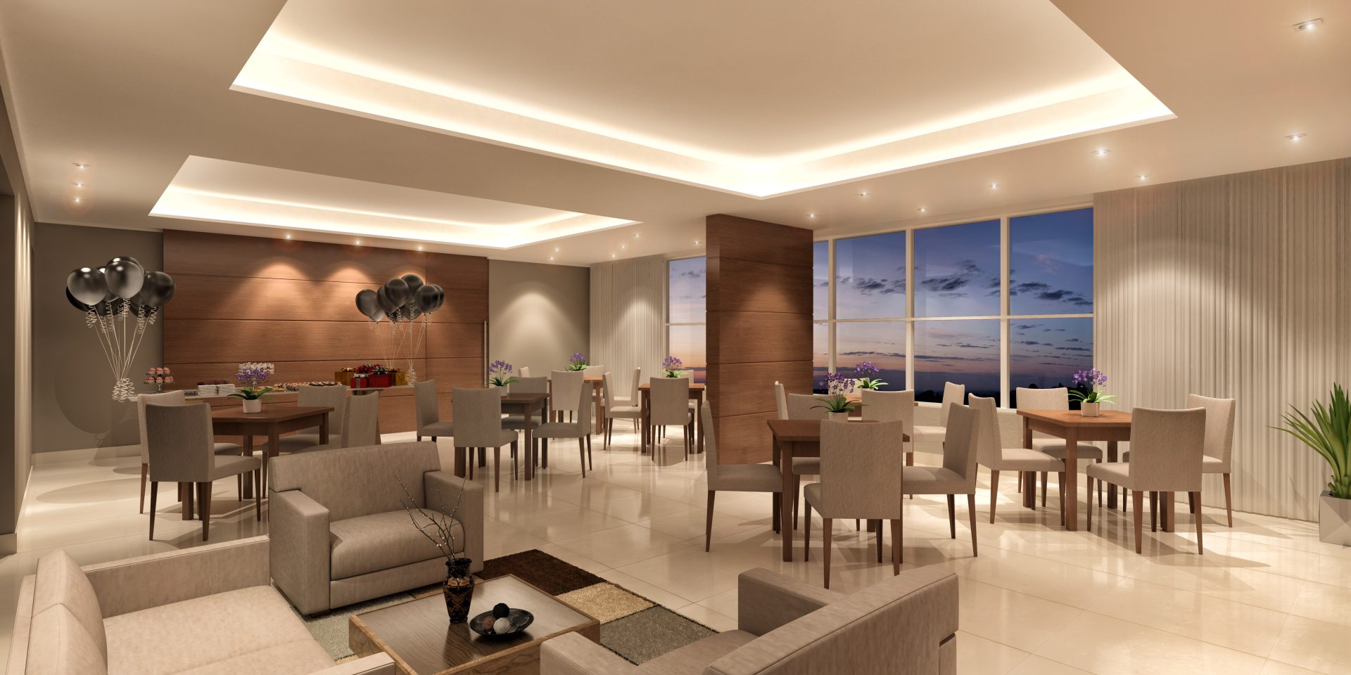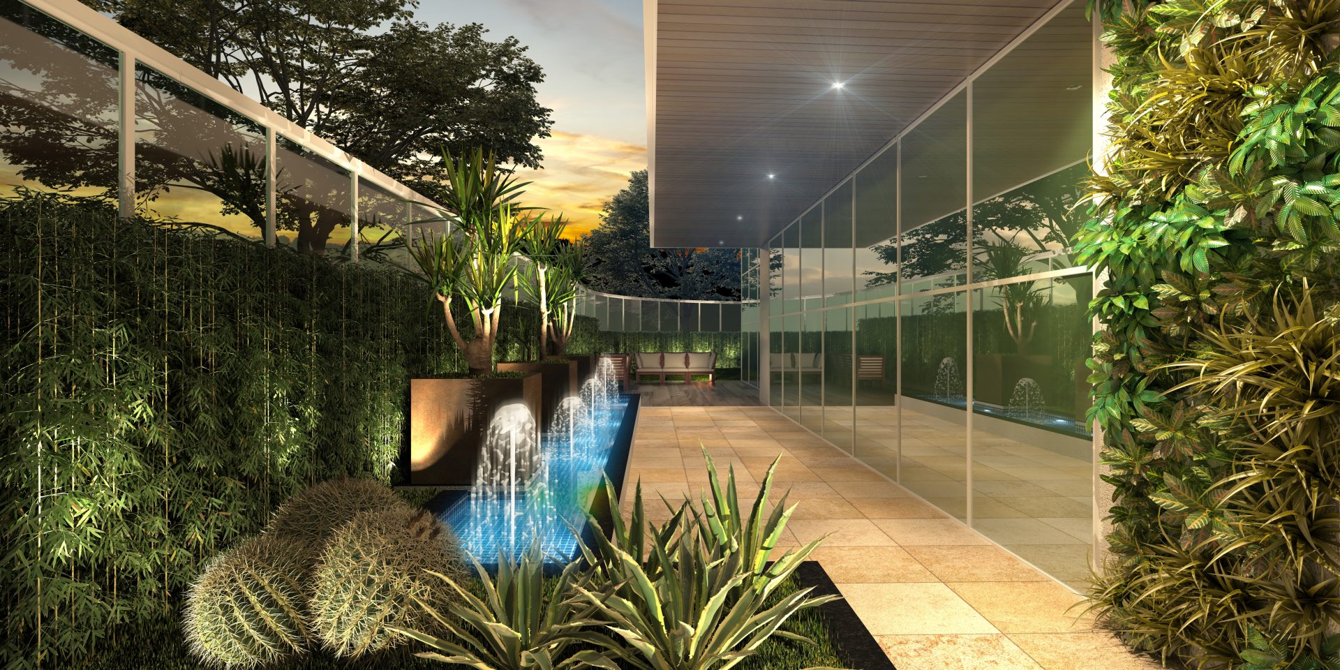 No térreo, além das 46 vagas de estacionamento, há um pátio frontal de acesso para pedestres, com área de convivência e espelho d’água, hall social, portaria, sala de administração, espaço business e 5 vagas para visitantes.