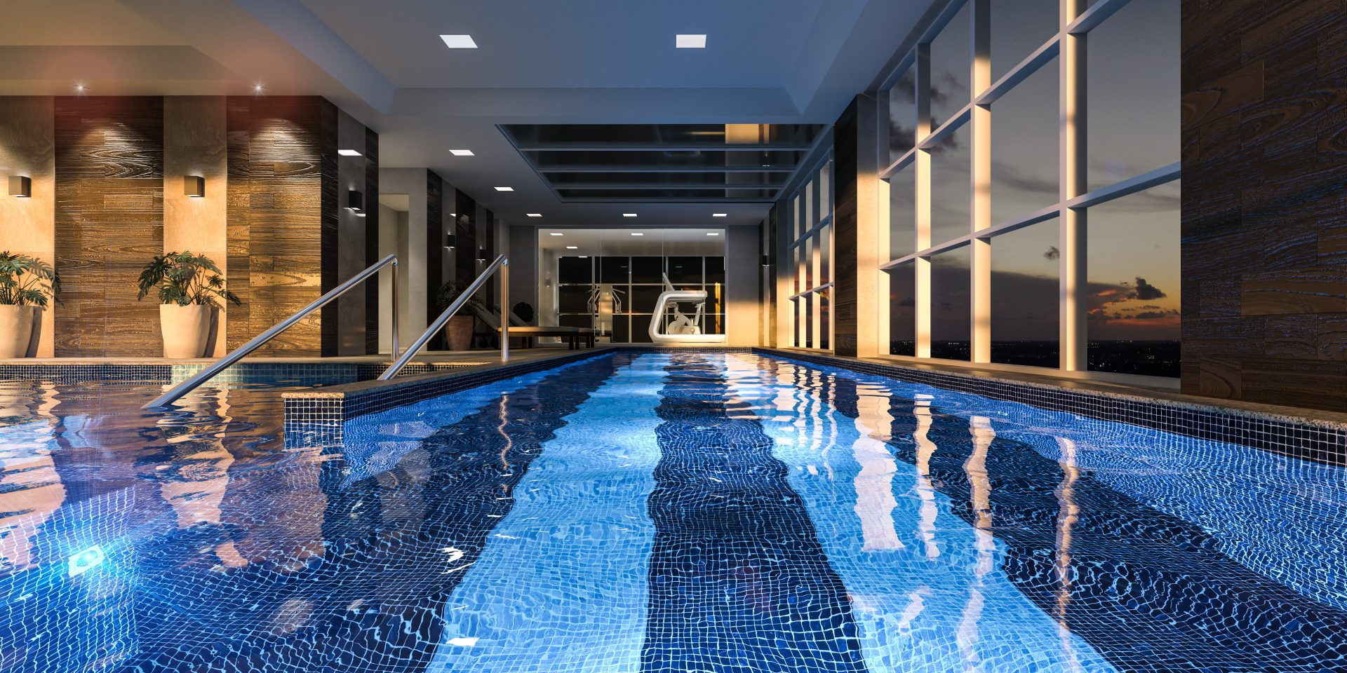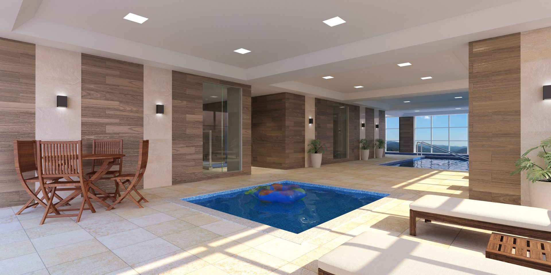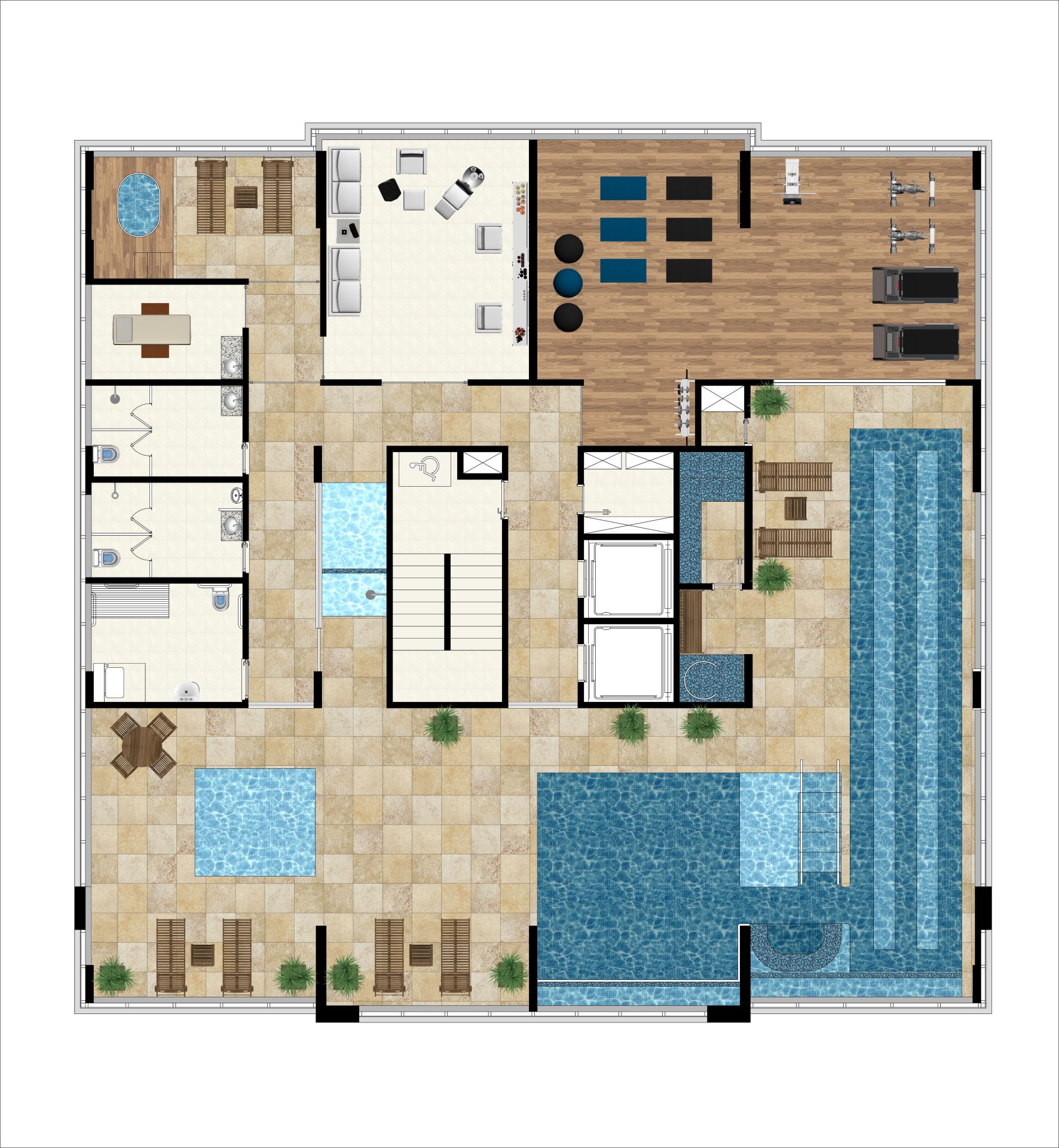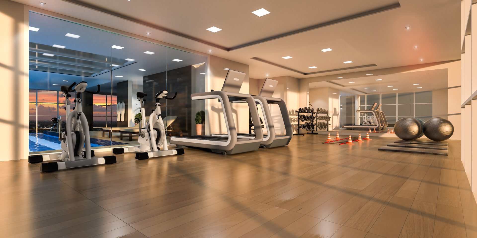 O terceiro andar é dedicado aos vestiários (masculino, feminino e PCD), spa com ofurô, espaço estético, espaço fitness, piscina infantil, piscina adulto e uma raia de 12,50 metros, todas com borda infinita para a pele de vidro.