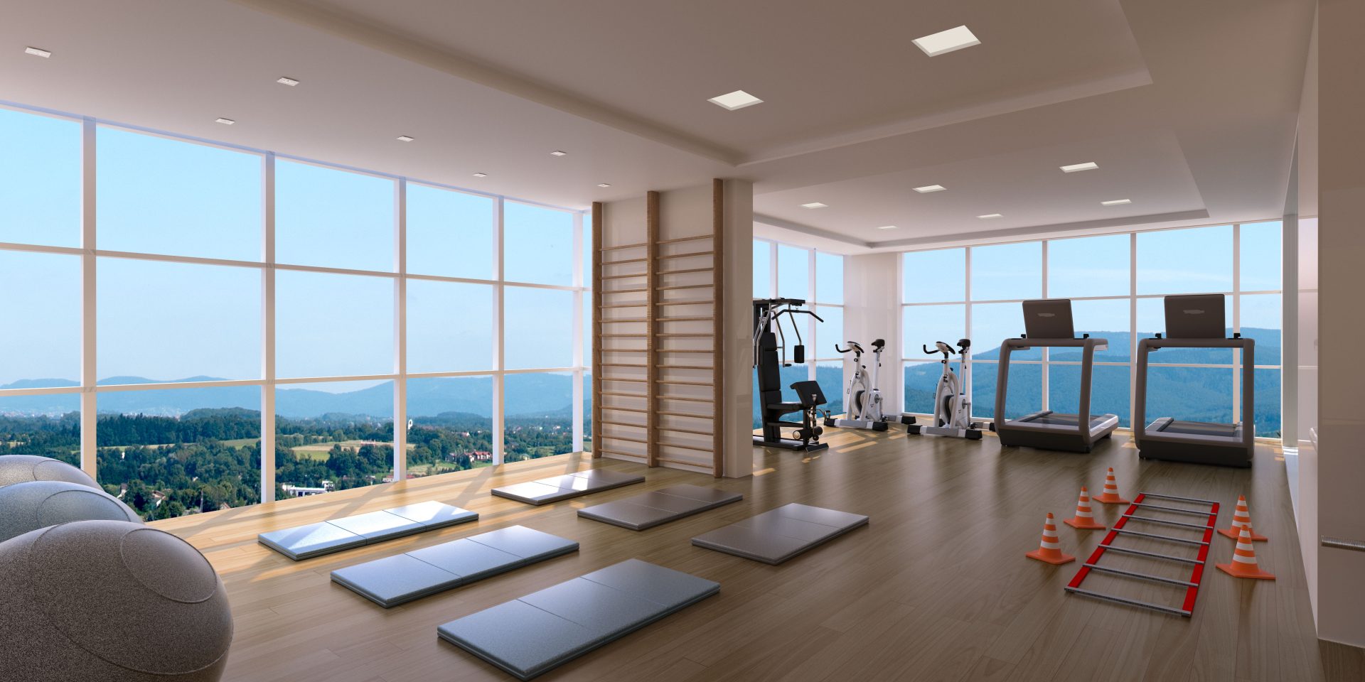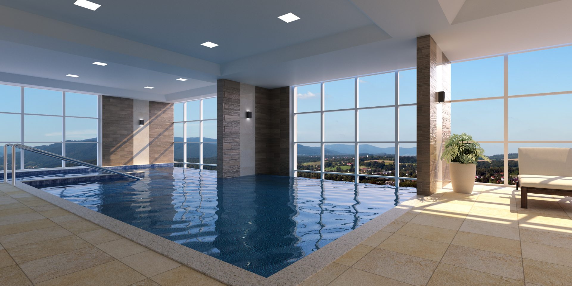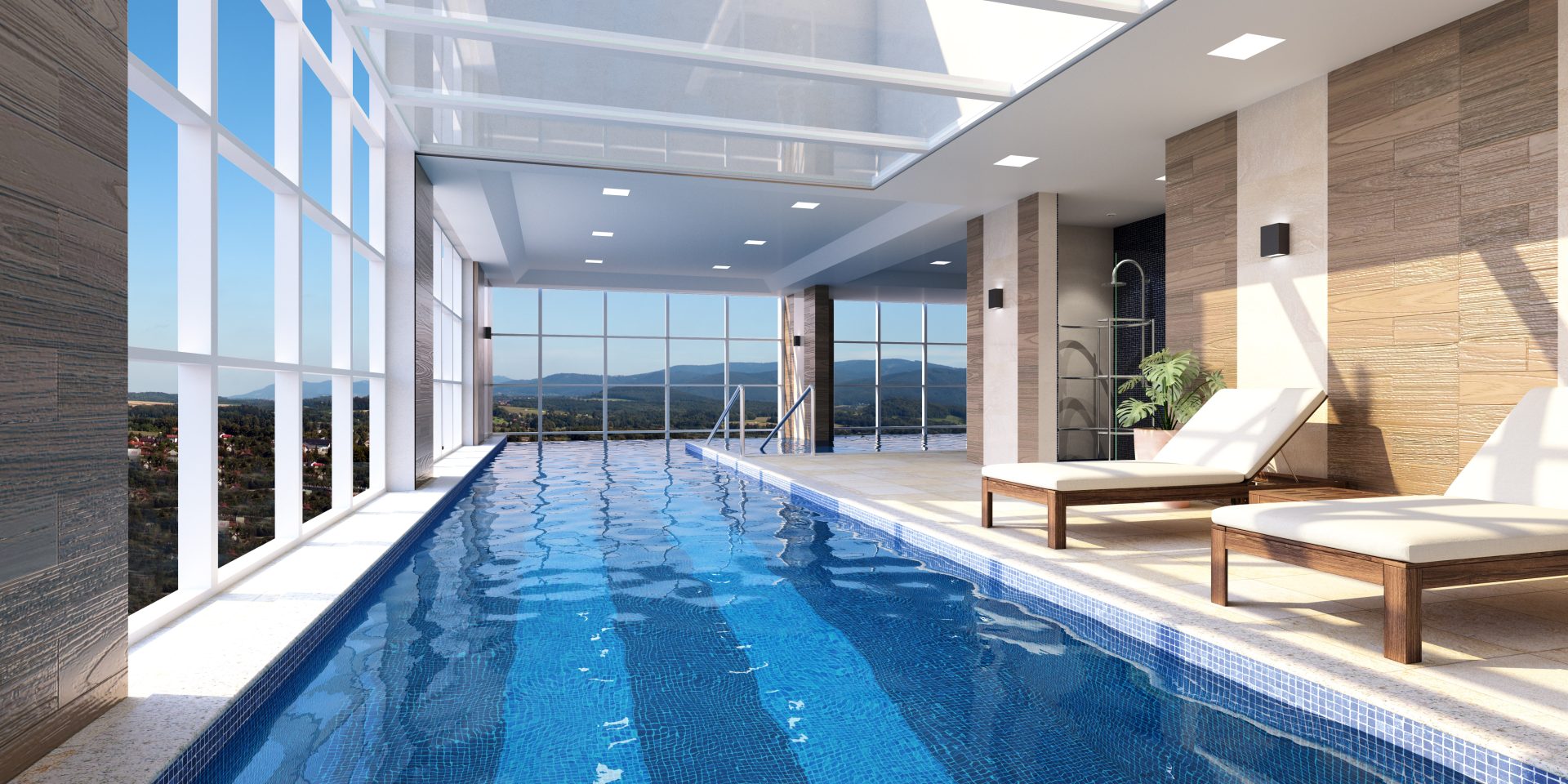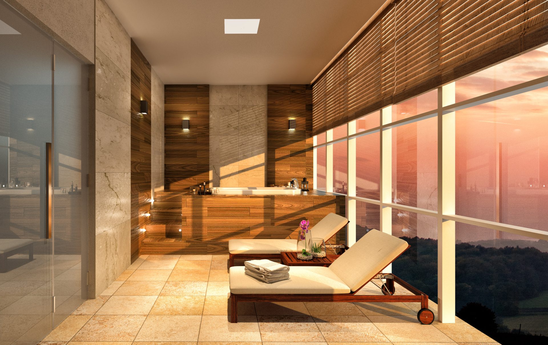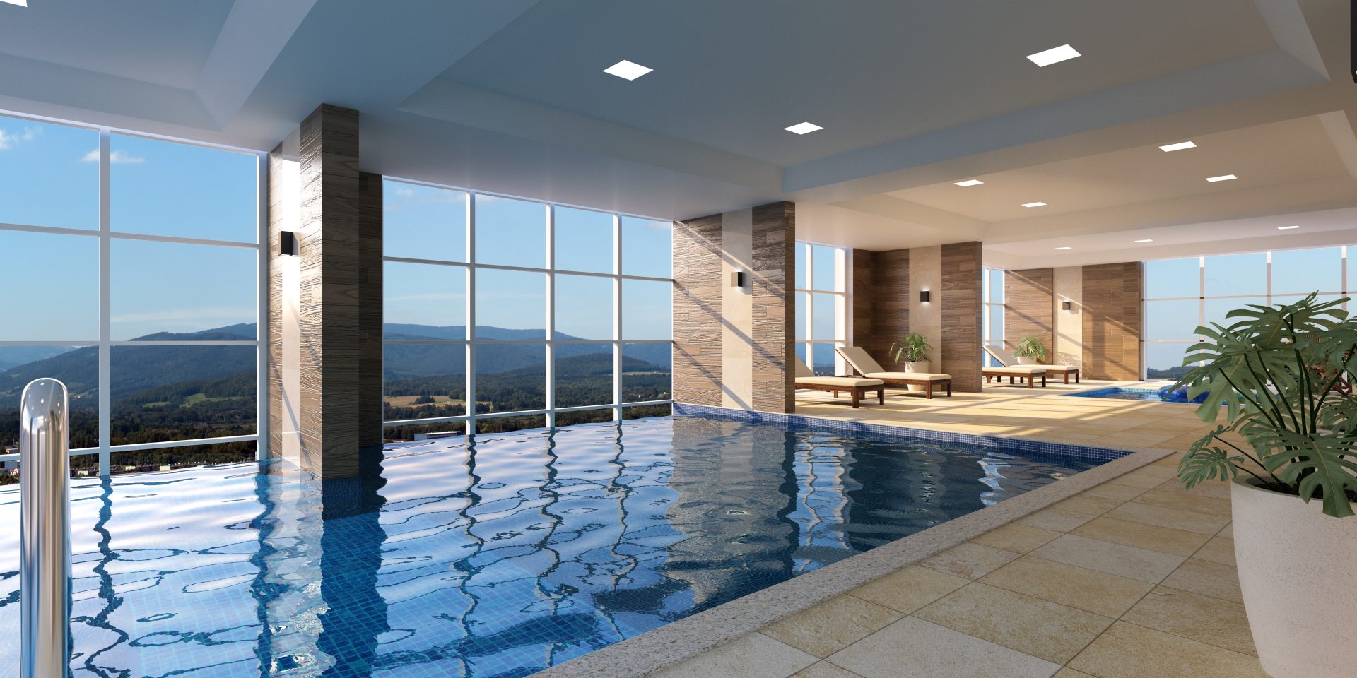 O terceiro andar é dedicado aos vestiários (masculino, feminino e PCD), spa com ofurô, espaço estético, espaço fitness, piscina infantil, piscina adulto e uma raia de 12,50 metros, todas com borda infinita para a pele de vidro.
