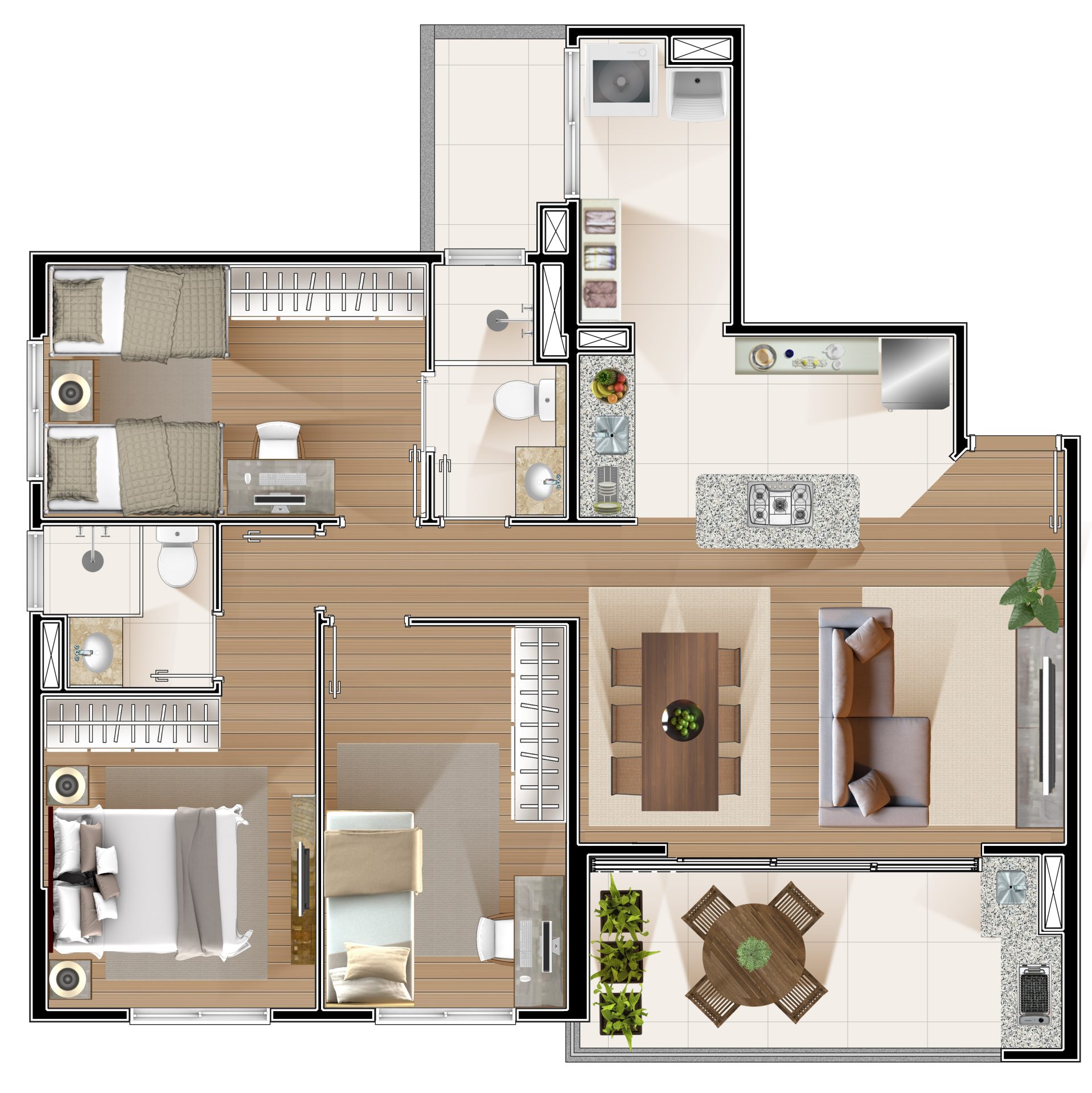 Os andares tipo começam no quarto pavimento, com apartamentos de 85,50m², 3 dormitórios (sendo uma suíte), sala de estar, jantar e cozinha integradas, e uma ampla sacada gourmet.